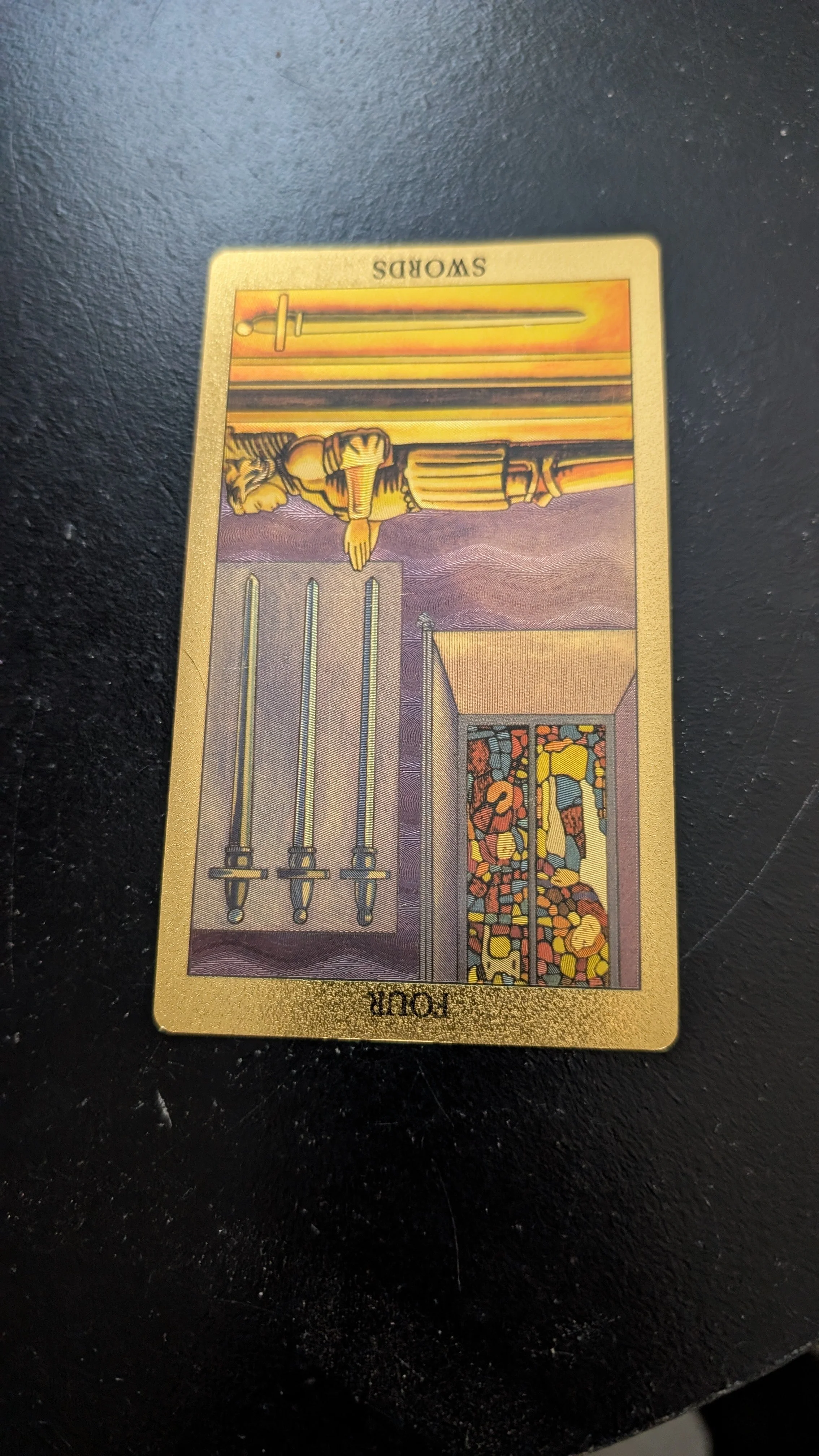 When upright, the 4 of Swords can infer rest and peace. Three swords are hanging unneeded on the wall as a person rests peacefully below them, with another sword within reach below.